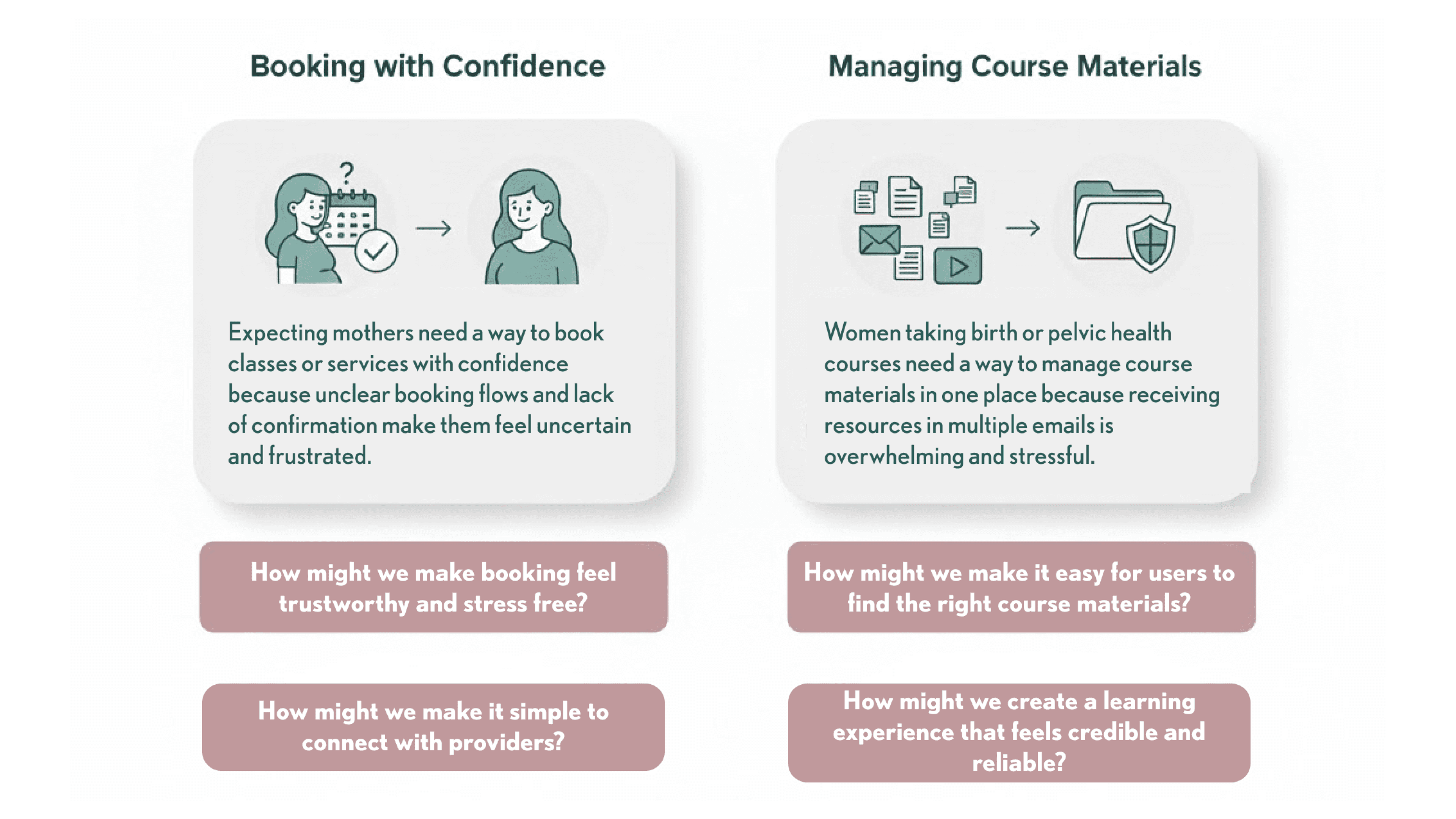 Research revealed two pain points: booking uncertainty and course material overwhelm. I translated these into problem statements focusing on users' needs for confidence and organization, then reframed them as "How Might We" questions to guide ideation toward solutions that build trust and reduce stress.