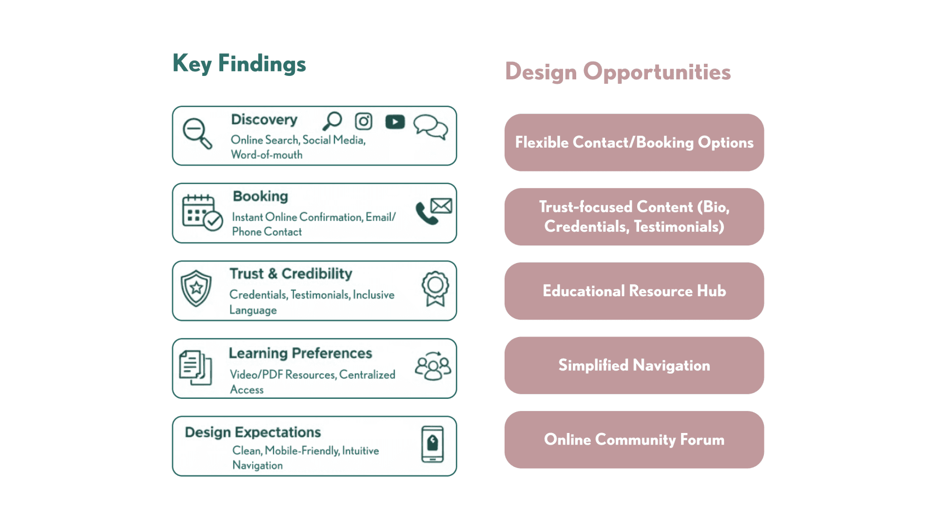 Research findings showed that users choose services they trust fast, want flexible learning options, and judge credibility instantly through clean design, clear booking, and human language.