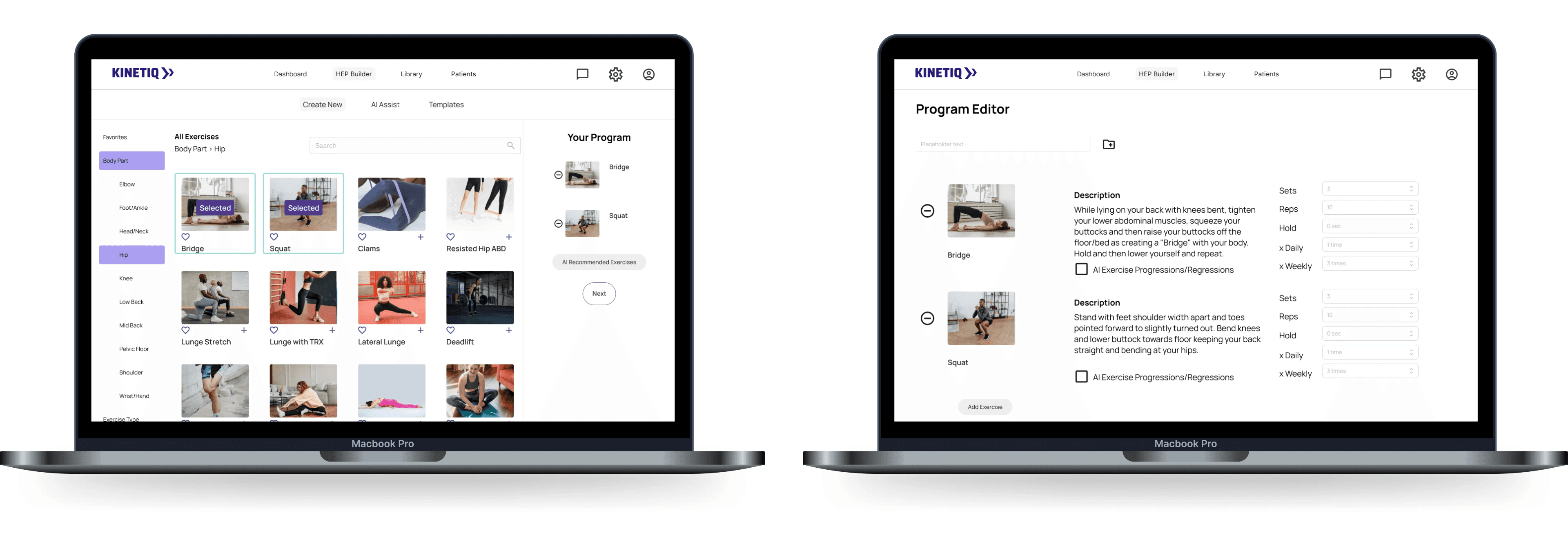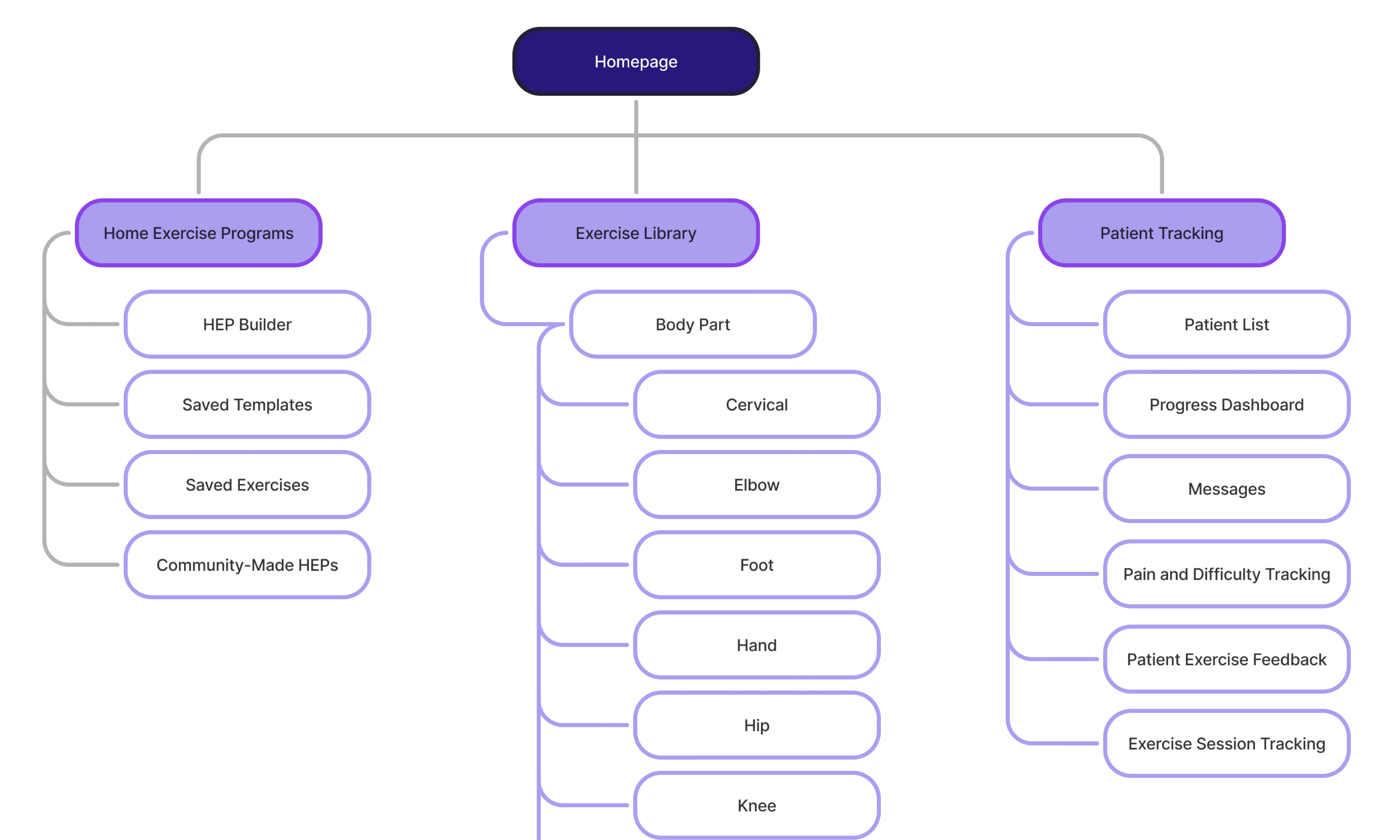 Based on research insights, I organized the platform into three main sections that mirror clinician workflows: building HEPs, browsing exercises by body region, and managing patient care through tracking and communication tools.