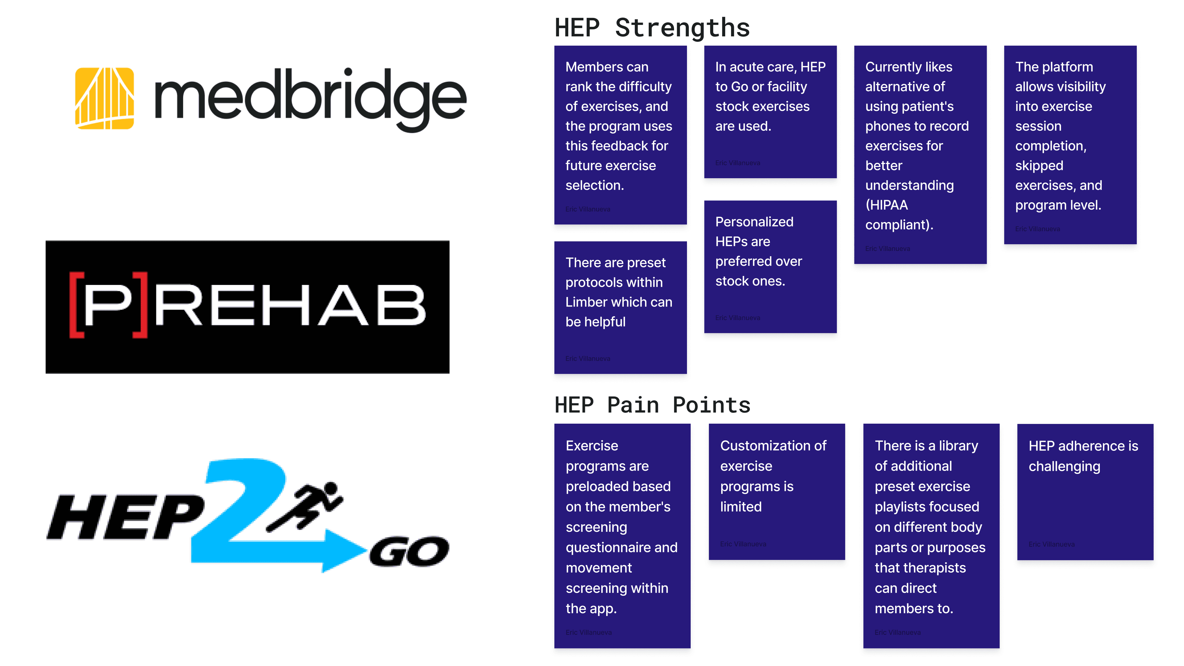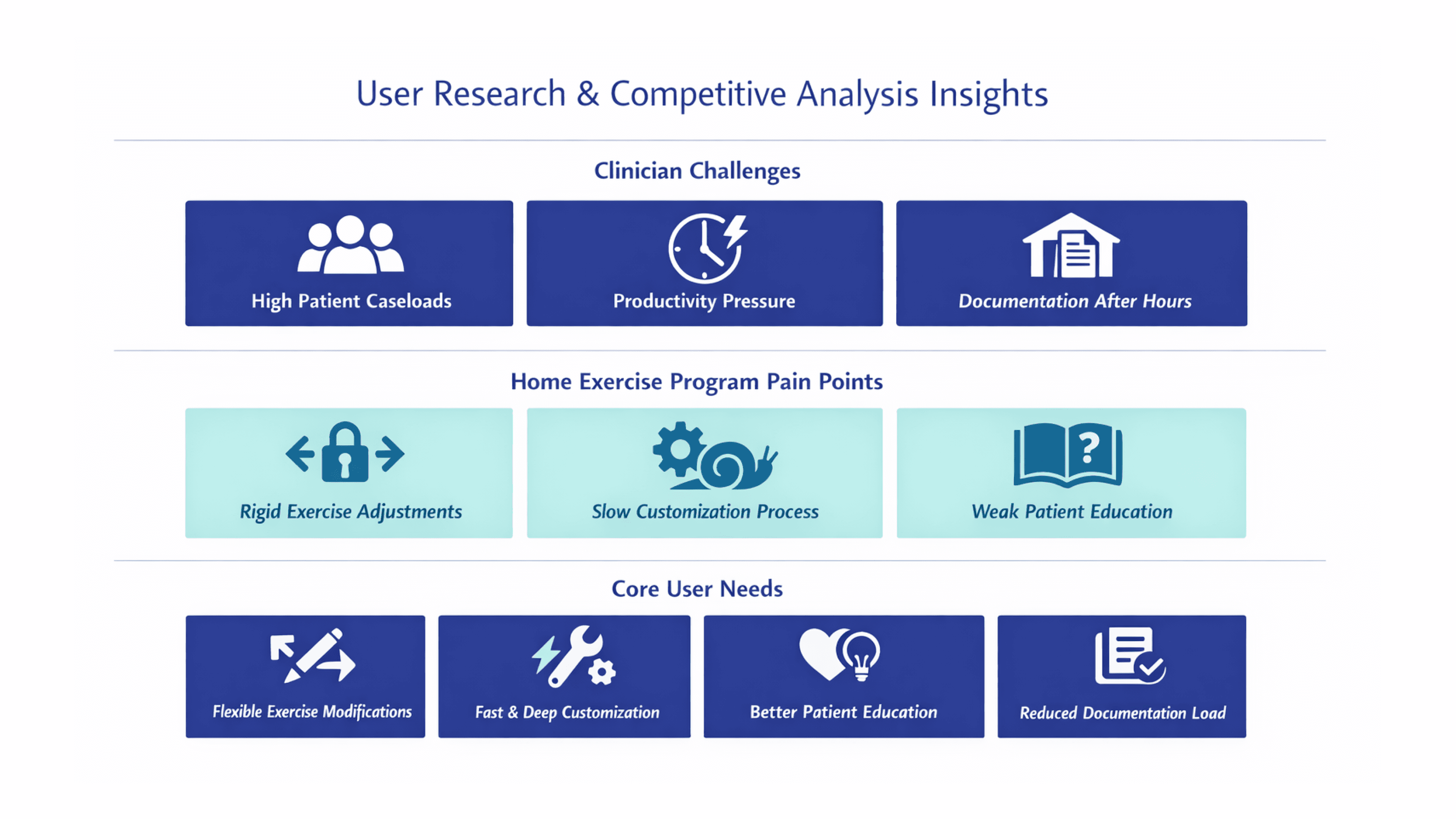 Initiated the project with comprehensive user research, analyzing competitors and identifying gaps with current rehab software. To understand the daily realities of physical therapy clinicians, I conducted one-on-one interviews with PTs and PTAs across diverse clinical settings and experience levels. These conversations explored how clinicians manage documentation, communicate with patients, and plan treatments — revealing critical pain points in their workflows.