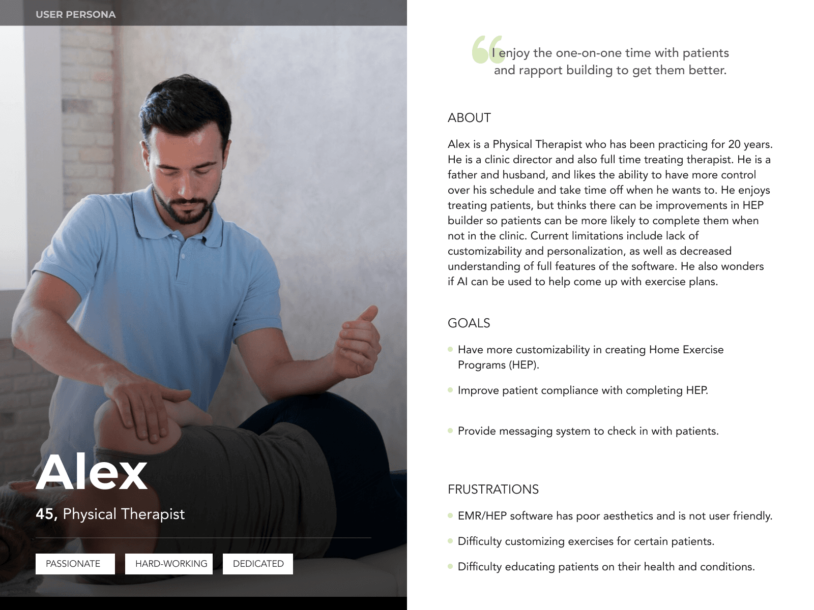 Alex is an experienced PT who wants to have a better HEP builder and a way to keep patients engaged and compliant in their treatment/plan of care. He gets frustrated with poorly designed and not user friendly EMR/HEP software.