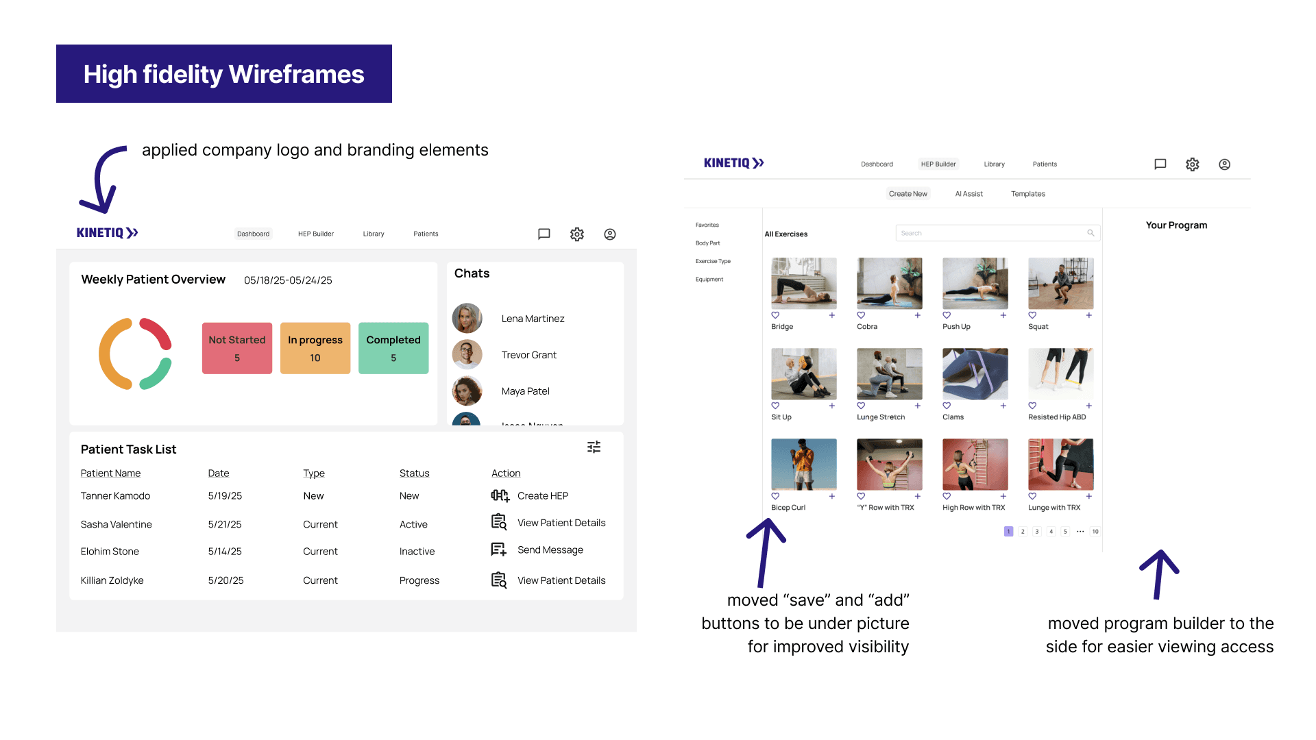 With additional time, I would expand the solution to include the patient-facing experience. I would design how patients view and complete their HEPs, as well as messaging functionality to facilitate communication between clinicians and patients. I'd also create mobile-responsive versions for both user groups, as many clinicians work across devices and patients primarily access programs from their phones.
